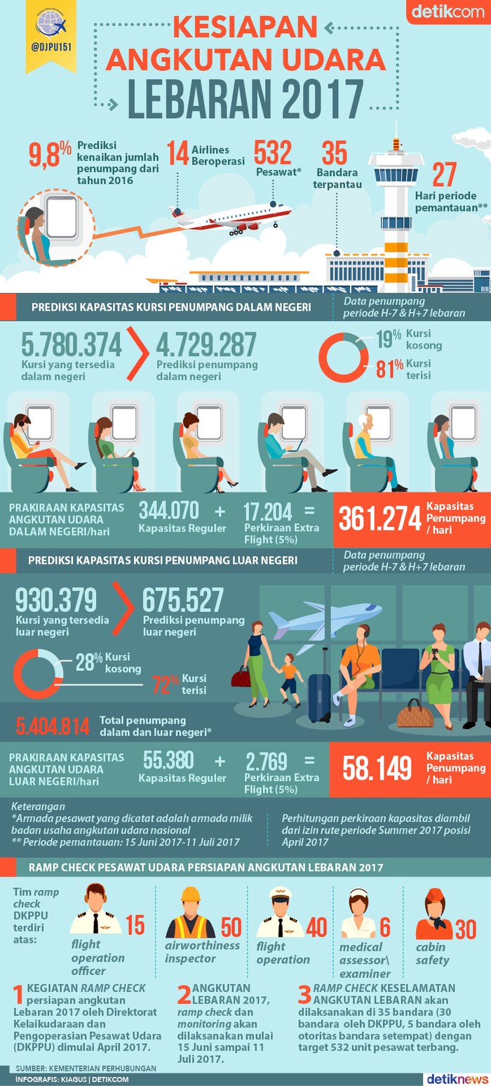 Jakarta - Penumpang transportasi angkutan udara pada periode lebaran 2017/ 1438 H diperkirakan meningkat. Direktorat Jenderal Perhubungan Udara Kementerian Perhubungan, memperkirakan jumlah penumpang angkutan udara Lebaran tahun 2017 ini akan meningkat 9,8 persen dibanding tahun 2016 lalu.