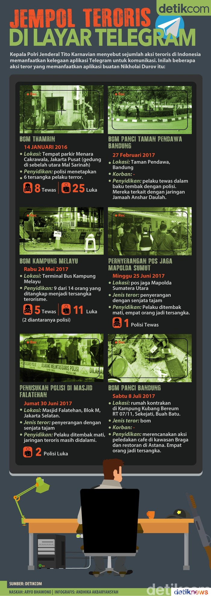 Jakarta - Kapolri Jenderal Tito Karnavian menyebut sejumlah aksi teroris di Indonesia memanfaatkan kelegaan aplikasi Telegram untuk komunikasi. Inilah beberapa aksi teror yang memanfaatkan aplikasi buatan Nikholai Durov itu: