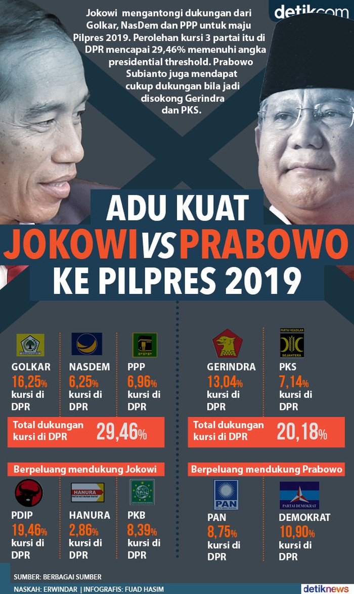 Jakarta - Joko Widodo (Jokowi) sudah mengantongi dukungan dari Golkar, NasDem dan PPP untuk maju Pilpres 2019. Perolehan kursi 3 partai itu di DPR mencapai 29,92 persen, memenuhi angka presidential threshold. Prabowo Subianto juga mendapat cukup dukungan bila jadi disokong Gerindra dan PKS.