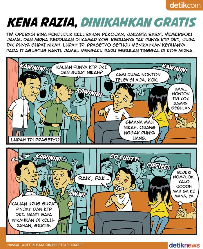 Jakarta - Tim Operasi Bida Penduduk Kelurahan Pekojan, Jakarta Barat memergoki Jamal dan Mirna berduaan di kamar kos. Keduanya tak punya KTP DKI, juga tak punya surat nikah. Lurah Tri Prasetyo setuju menikahkan keduanya pada Agustus nanti. Jamal mengaku baru sebulan tinggal di kos Mirna.