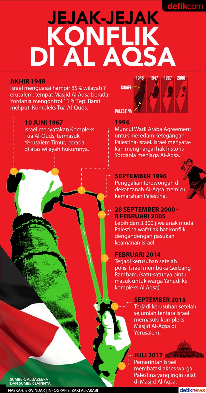 Jakarta - Konflik antara warga Palestina dan tentara Israel di kompleks Al Aqsa di Yerusalem sudah sekian dekade terjadi. Berikut ini rentetan konflik di Al Aqsa yang dihimpun detikcom dari sejumlah sumber.