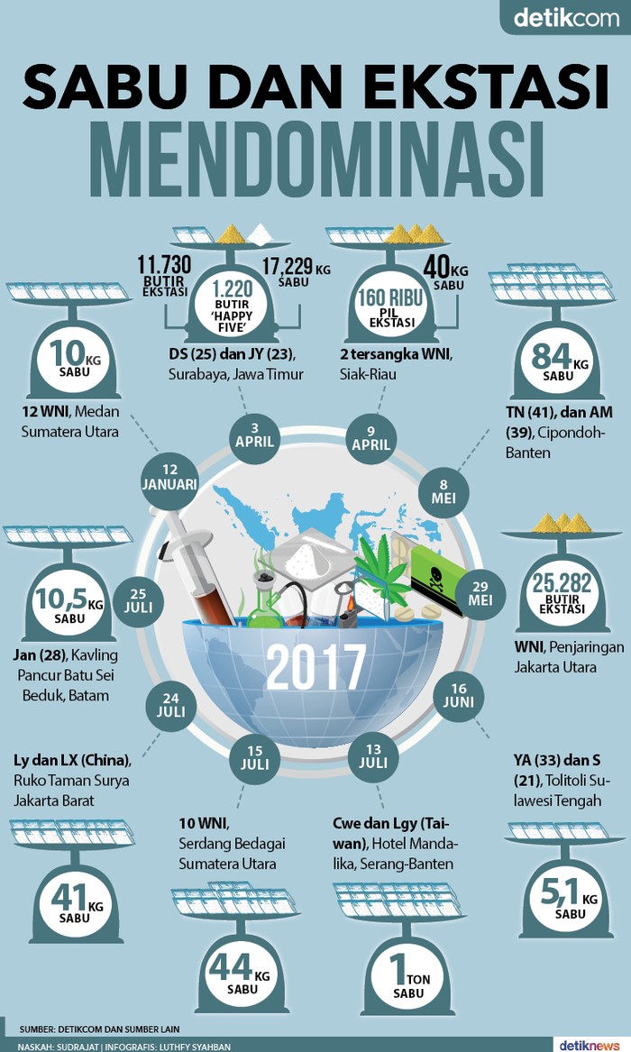 Jakarta - Indonesia menjadi target utama peredaran narkoba dunia, terutama sabu dan ekstasi. Beruntung aparat terkait berhasil menggagalkan upaya penyelundupan narkoba jenis itu dalam jumlah fantastis di berbagai daerah. Berikut ini data yang terekam detikcom dalam tujuh bulan terakhir.