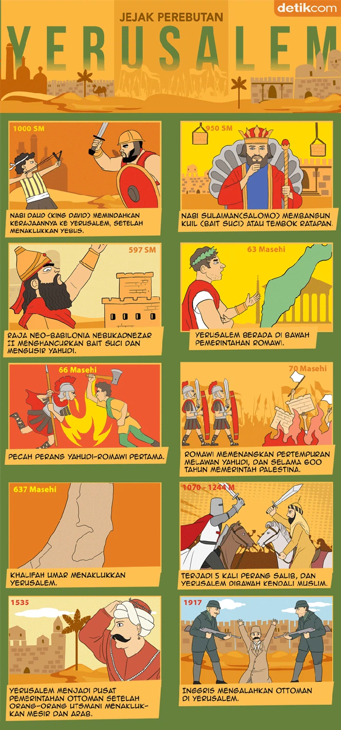 Jakarta - Sejak 637 Masehi, Yerusalem dibawah kendali Islam hingga Inggris mengalahkan Ottoman pada 1917. Konflik PalestinaβIsrael pasca Deklarasi Balfour, 1918
