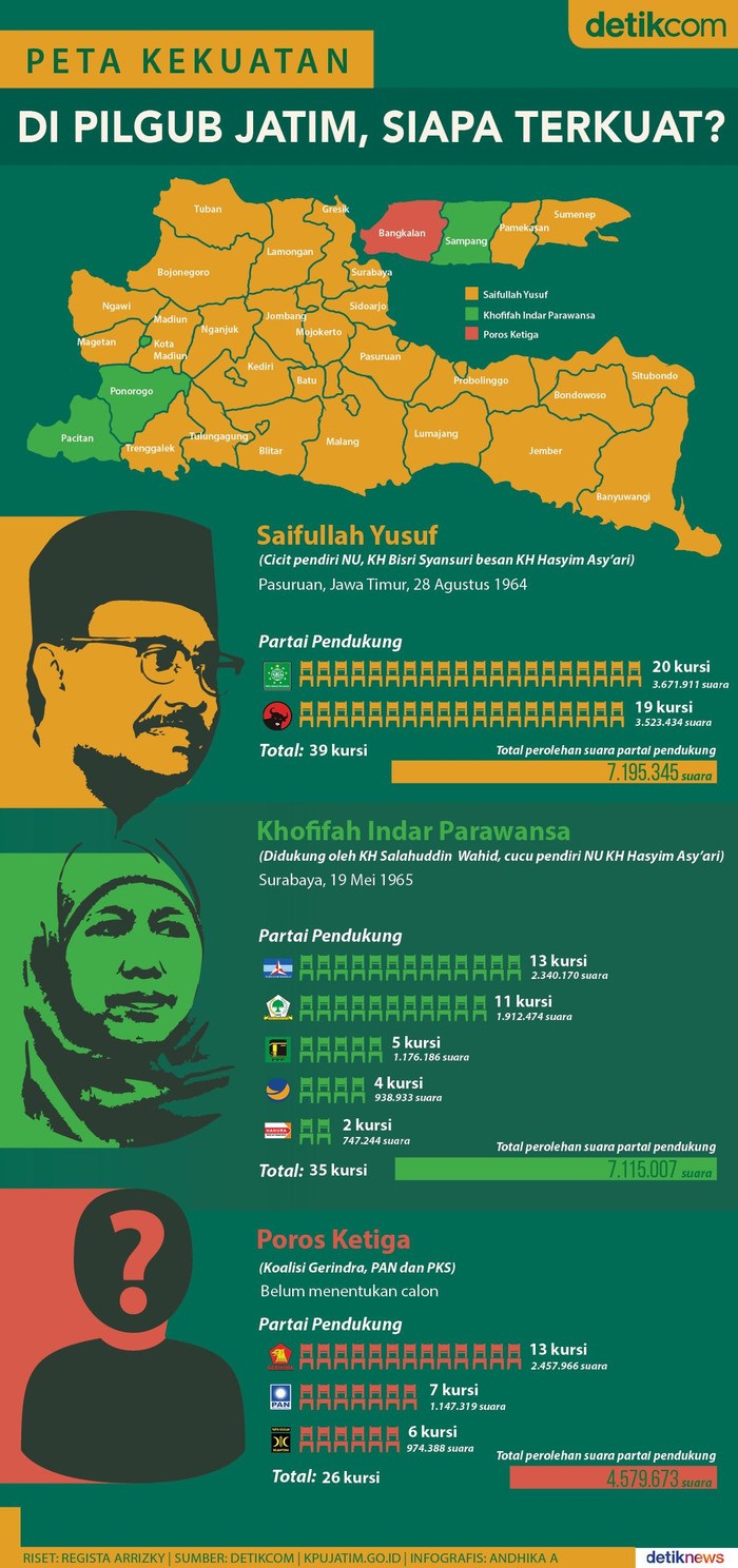 Jakarta - Dua pasang calon sudah memastikan maju Pilgub Jatim. Mereka adalah Saifullah Yusuf-Abdullah Azwar Anas dan Khofifah Indar Parawansa-Emil Dardak. Masih ada satu poros belum menentukan calon. Dari perolehan suara partai pendukung di Pemilu 2014 lalu, beginilah kekuatan masing-masing pasangan calon.