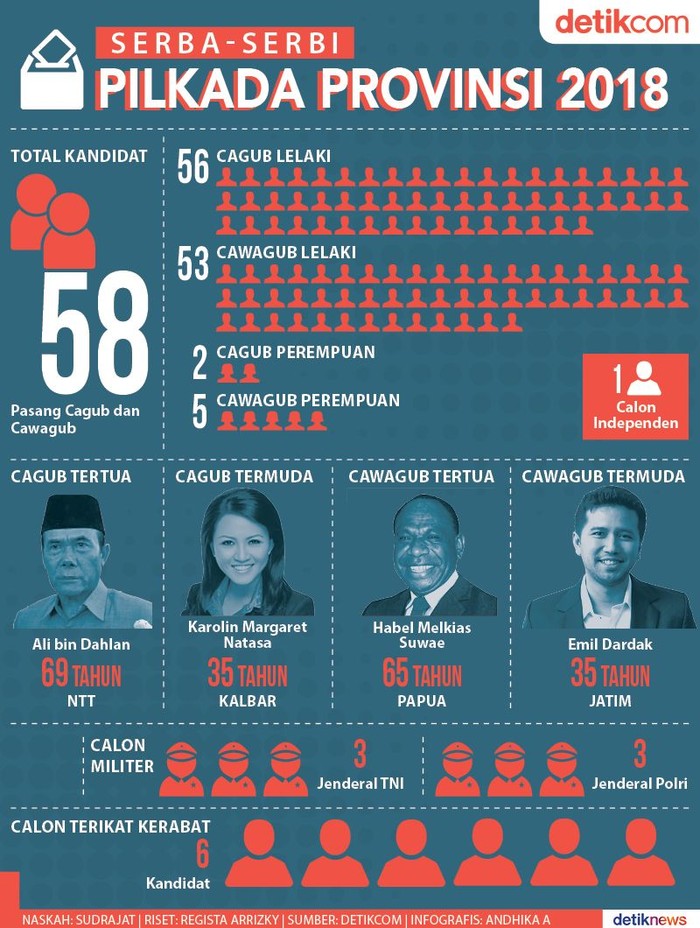 Jakarta - Dari 116 calon yang menjadi calon gubernur-wakil gubernur dalam pilkada 2018, dari kalangan perempuan cuma 7 orang.