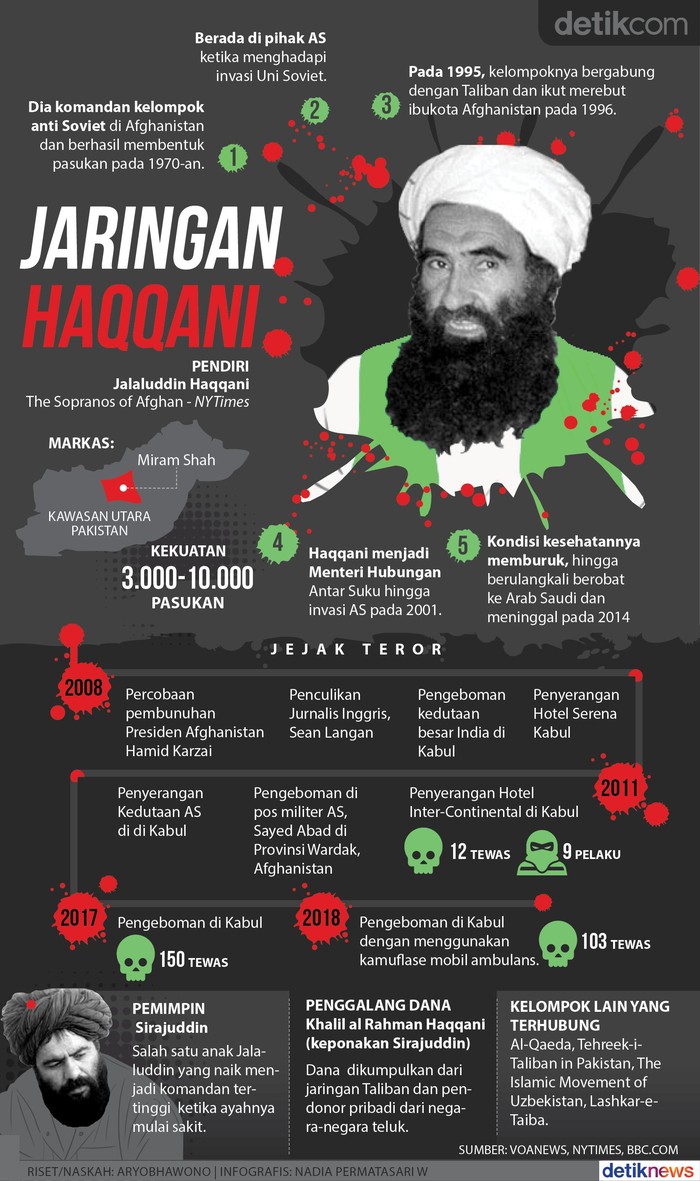 Jakarta - Jaringan Haqqani dituduh menjadi pihak yang bertanggung jawab atas ledakan bombunuh diri yang menewaskan sedikitnya 103 orang di Kabul, Afghanistan. Kelompok itu telah beberapa kali dituduh berada di belakang sejumlah aksi teror di seluruh wilayah negeri itu pasca invasi Amerika Serikat.