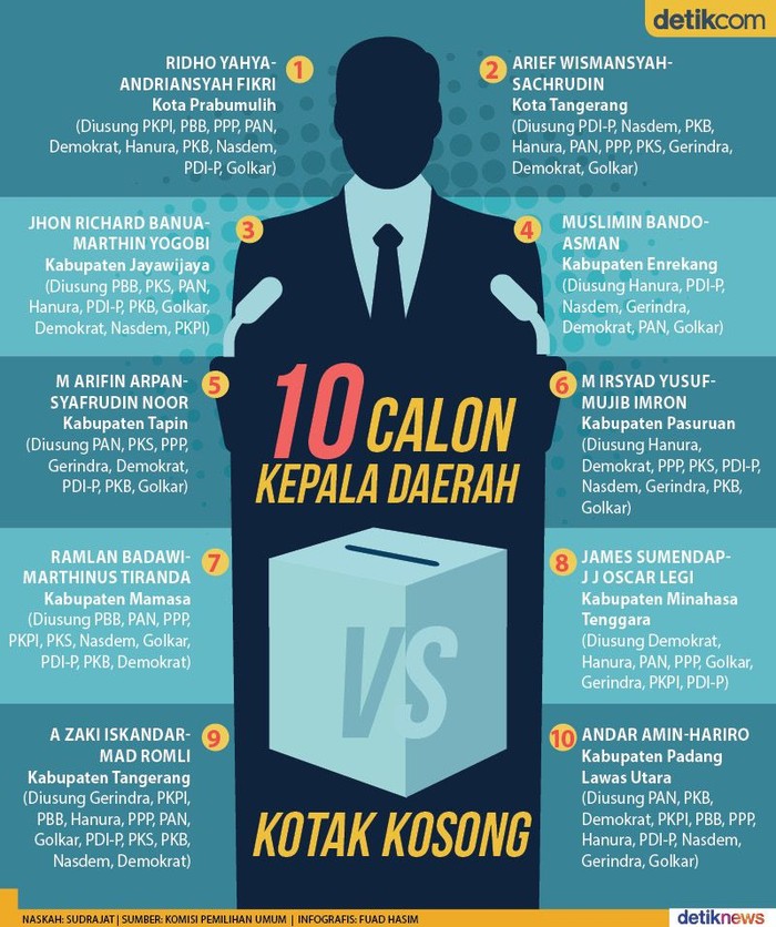 Jakarta - Dari hasil rekapitulasi KPU, ada 10 daerah dengan pasangan calon tunggal. Artinya, pemilih akan memilih satu pasangan calon atau kotak kosong.