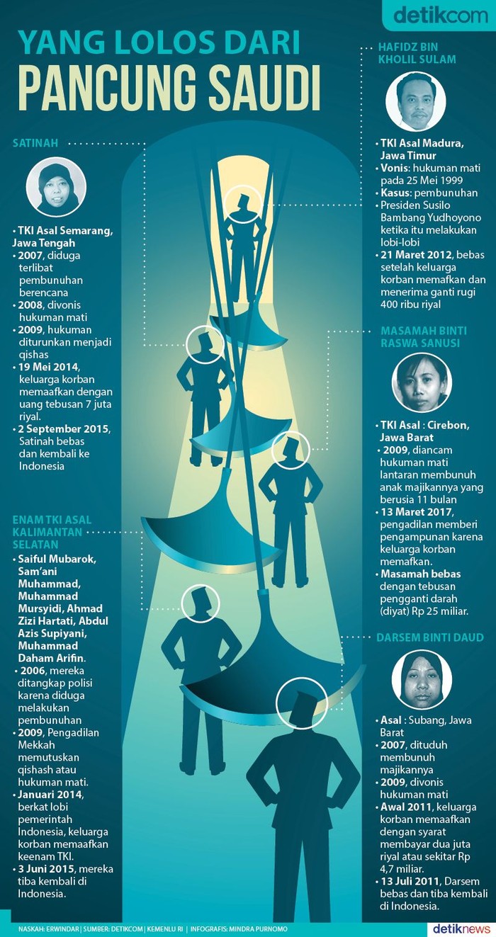 Jakarta - Tak semua TKI yang divonis hukuman mati di Arab Saudi dieksekusi. Mereka lolos dari Pancung Saudi setelah ada kata maaf dari keluarga korban, dan membayar denda (diyat) miliaran rupiah.