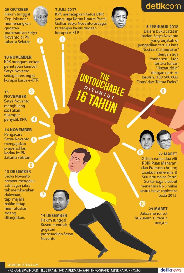 Jakarta - Kasus mega korupsi e-KTP mematahkan citra Setya Novanto sebagai politisi licin yang tak tersentuh hukum. Jaksa KPK menuntutnya 16 tahun penjara dan menolak status justice collaborator