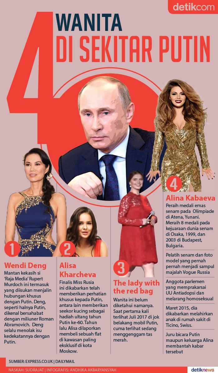 Jakarta - Setelah berumah tangga selama 31 tahun, Vladimir Putin bercerai Lyudmila Putina pada 2014. Dalam status duda, Presiden Rusia itu pernah digosipkan dengan sejumlah wanita cantik.