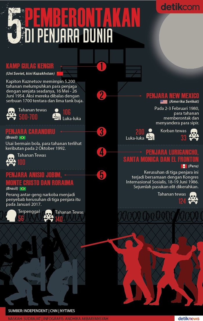 Jakarta - Aksi para teroris di Rutan Mako Brimob yang menyandera dan membunuh 5 polisi mendapat perhatian publik hingga mancanegara. Di berbagai penjuru bumi pernah terjadi kerusuhan di dalam penjara, berikut ini yang paling brutal.