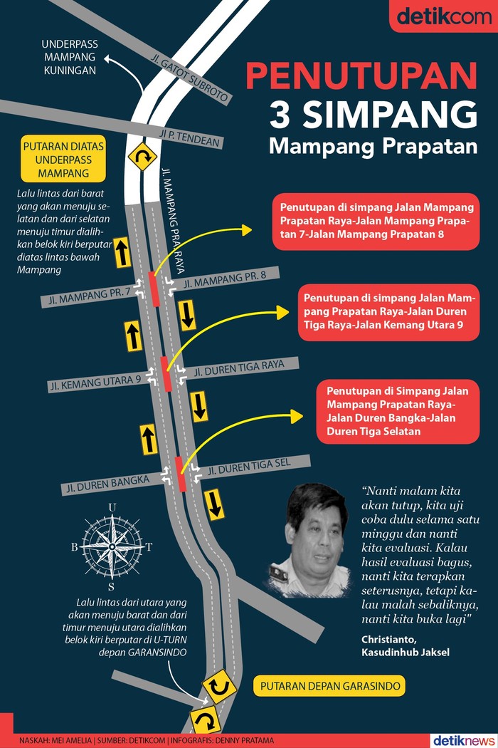 Jakarta - Tiga persimpangan di Jalan Mampang Prapatan, Jakarta Selatan, akan ditutup. Penutupan diuji coba selama satu pekan, sejak Jumat (18/5/2018)