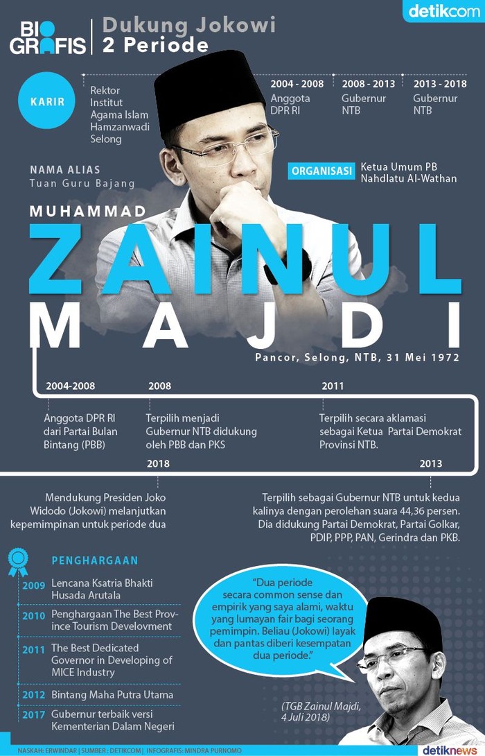 Jakarta - Muhammad Zainul Majdi alias Tuan Guru Bajang (TGB) mendukung Presiden Joko Widodo (Jokowi) melanjutkan kepemimpinannya ke periode 2. Pernah menjadi Ketua DPD Demokrat NTB berikut ini jejak politik TGB.