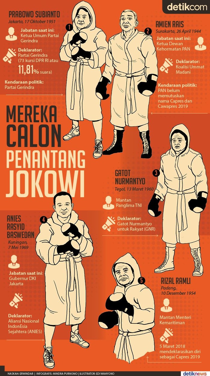 Jakarta - Sebulan menjelang pendaftaran, sejumlah tokoh dideklarasikan sebagai calon presiden 2019-2024. Prabowo, Amien Rais, Anies Baswedan, Gatot Nurmantyo dan Rizal Ramli siap melawan Joko Widodo (Jokowi) sang petahana,
