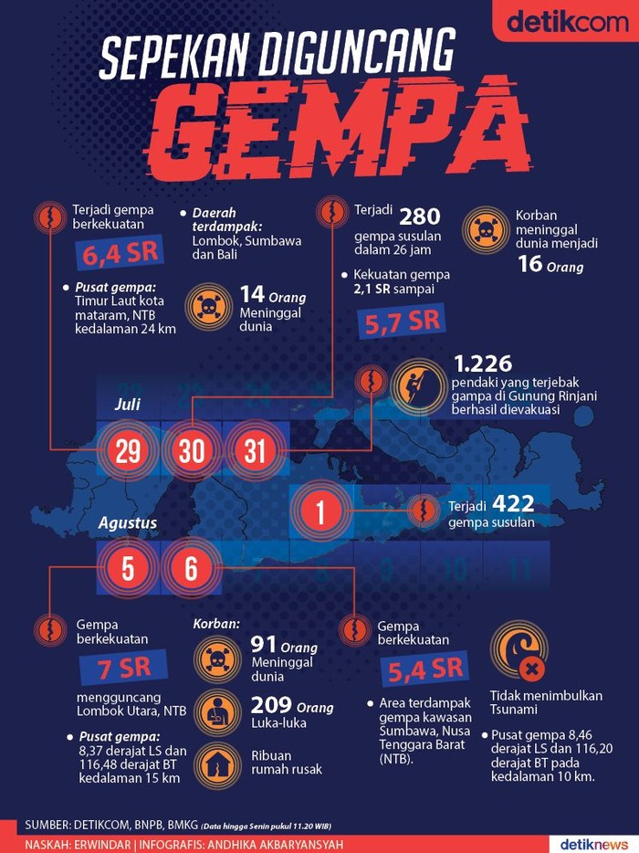 Jakarta - Gempa kembali terjadi di Nusa Tenggara Barat. Pada Minggu (5/8/2018) kemarin gempa berkekuatan 7 Skala Richter (SR) menguncang kawasan Lombok Utara, NTB. Persis sepekan lalu, wilayah Lombok Timur juga diguncang gempa.