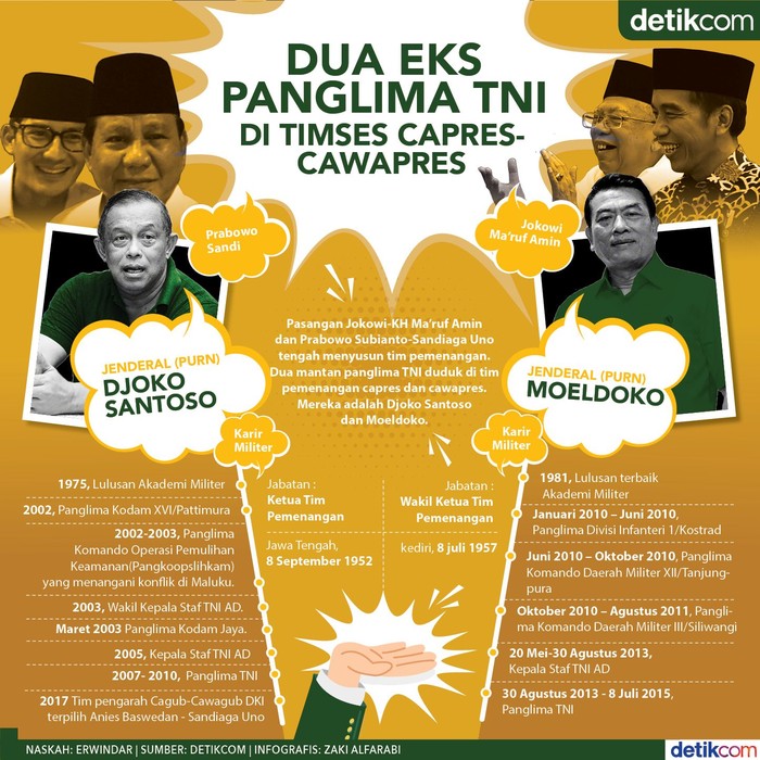 Jakarta - Setelah mendaftarkan diri ke KPU, pasangan Jokowi-KH Ma'ruf Amin dan Prabowo-Sandiaga Uno membentuk tim sukses. Merekrut mantan Panglima TNI untuk atur strategi.
