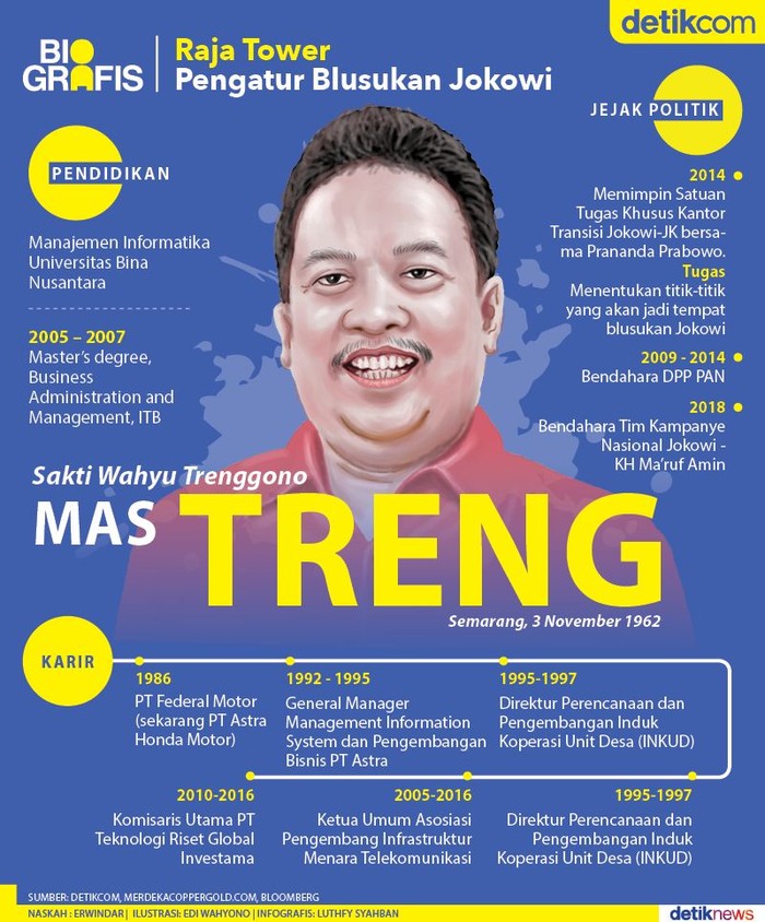 Jakarta - Dia dijuluki Raja Menara karena menjadi penyedia 14.000 menara telekomunikasi. Pada 2014 Sakti Wahyu Trenggono menjadi pengatur blusukan Jokowi, kini bendahara tim kampanye.