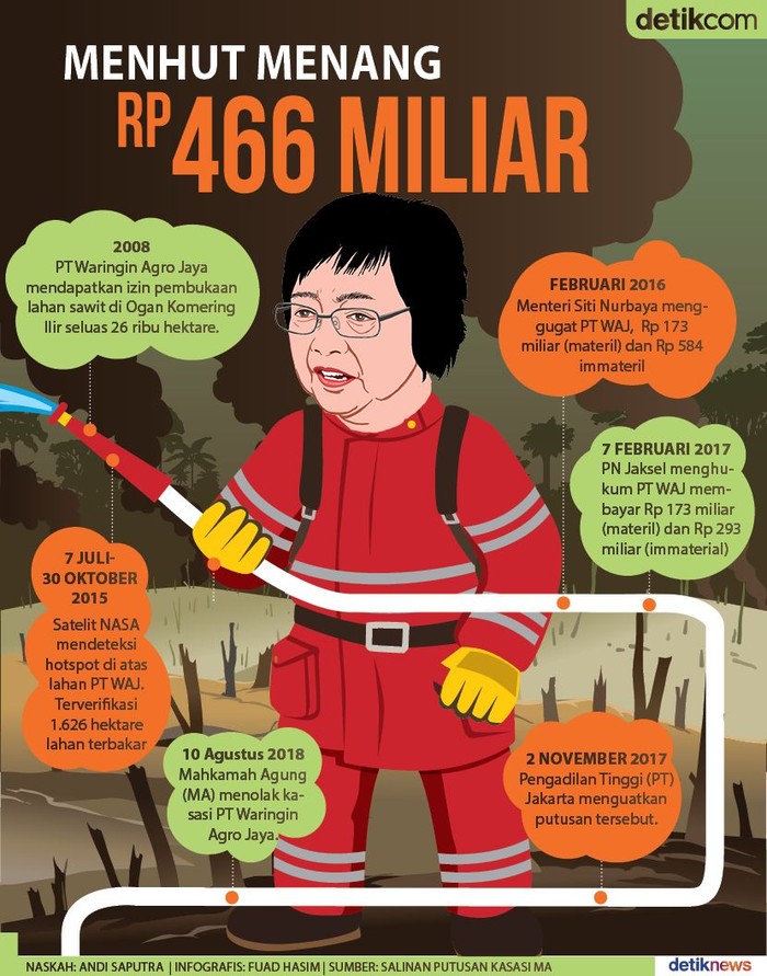 Jakarta - Kementerian Lingkungan Hidup dan Kehutanan (KLHK) menggugat PT Waringin Agro Jaya (WAJ) karena membakar hutan dan lahan. Hasilnya, ia menang hingga tingkat kasasi atas gugatan Rp 466 miliar.