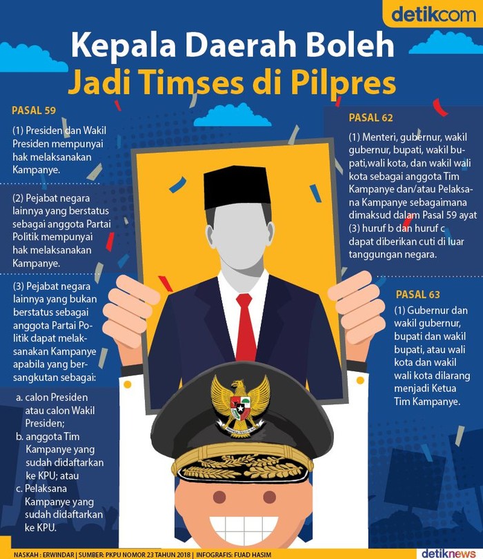 Jakarta - Sebanyak 31 kepala daerah di Jawa Timur menjadi tim sukses pasangan calon presiden dan wakil presiden, Joko Widodo-KH Ma'ruf Amin. PKPU nomor 23 Tahun 2018 tak melarang. Ini ketentuannya