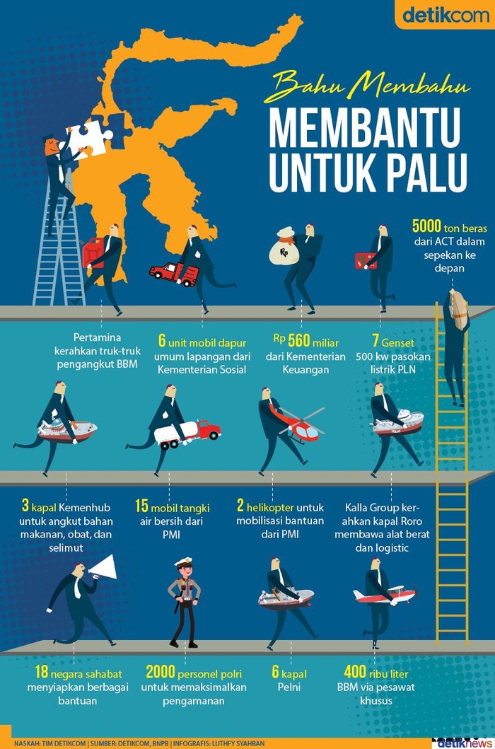 Jakarta - Berbagai pihak di tanah air dan sejumlah negara sahabat bahu membahu membantu korban gempa dan tsunami di Palu, Sigi dan Donggala Sulawesi Tengah.