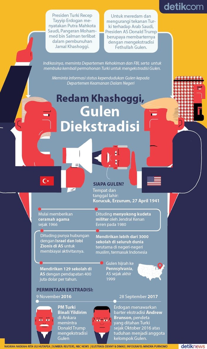 Jakarta - Untuk meredam tekanan Turki ke Saudi, AS berupaya mengekstradisi Fethullah Gulen yang dituding mendalangi kudeta militer terhadap Erdogan pada 15 Juli 2016.