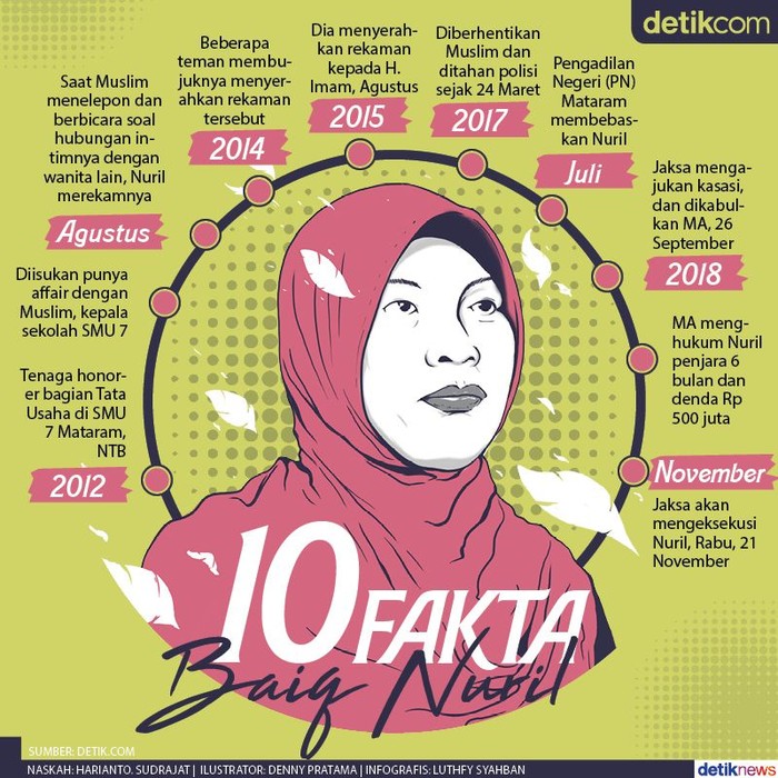 Jakarta - Upaya Baiq Nuril Makmun melindungi diri dari pelecehan oleh atasan malah mengancam dirinya ke penjara. Jaksa akan memenjarakan Nuril mulai Rabu (22/11/2018), menindaklanjuti putusan kasasi Mahkamah Agung.