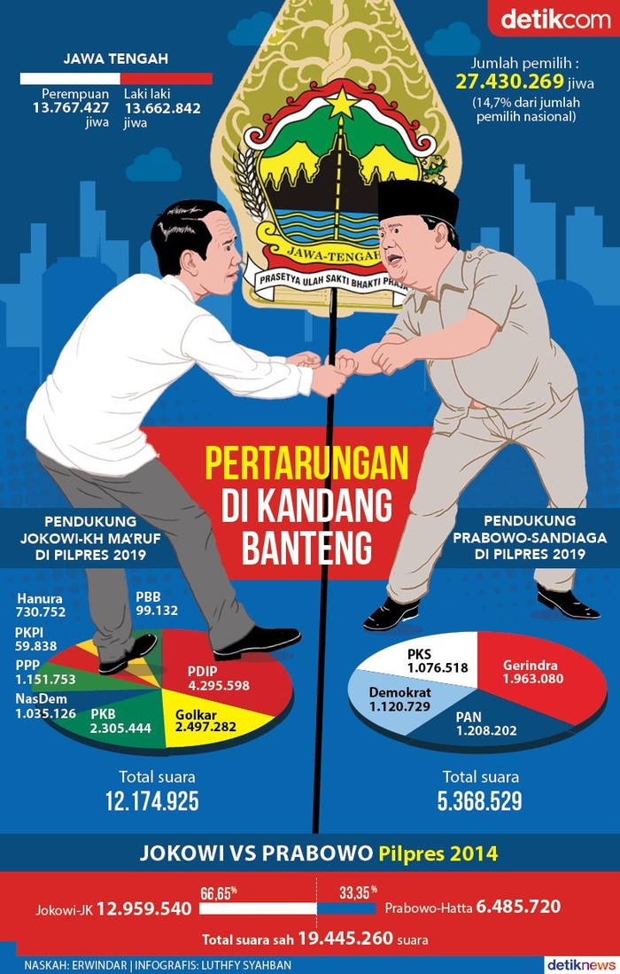 Jakarta - Kubu Prabowo Subianto-Sandiaga Salahudin Uno menjadikan Jawa Tengah sebagai salah satu fokus 'pertempuran' di Pilpres 2019. Selama ini Jawa Tengah merupakan 'kandang Banteng', penyumbang suara terbesar bagi PDIP pengusung Jokowi-KH Ma'ruf Amin.