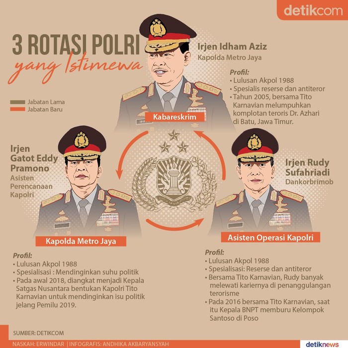 Jakarta - Kapolri Jenderal Tito Karnavian melakukan rotasi di tubuh Korps Bhayangkara. Tiga perwira tinggi, dua di antaranya spesialis antiteror ditarik ke ring satu Mabes Polri. Untuk persiapan pengamanan Pemilu 2019?