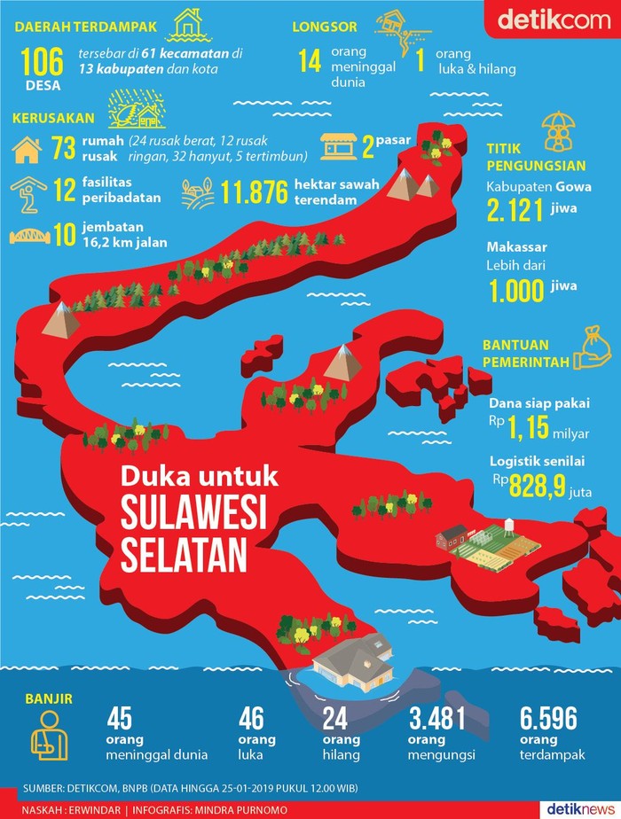Jakarta - Banjir dan tanah longsor yang melanda 13 kabupaten dan kota di Sulawesi Selatan pada Selasa lalu menyebabkan 45 orang meninggal dunia dan 3.481 warga mengungsi. Berikut ini data yang terekam hingga Jumat, 25 Januari 2019 siang.