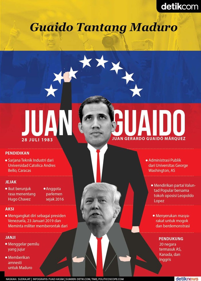 Jakarta - Pemimpin oposisi Venezuela Juan Guaido mendeklarasikan diri sebagai Presiden Venezueal dan meminta Nicolas Maduro mundur. Disokong Donald Trump dan Uni Eropa