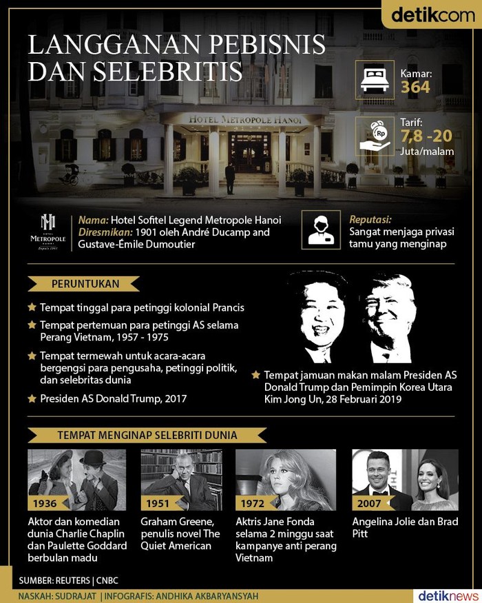 Jakarta - Hotel Metropole menjadi tempat makan malam Donald Trump dan Kim Jong Un, Kamis (28/2/2019). Selebriti dunia seperti Charlie Chaplin, Jane Fonda, dan Angelina Jolie pernah menginap di hotel itu.