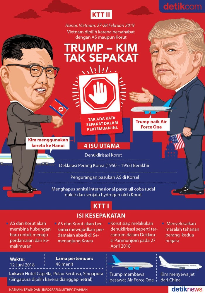 Jakarta - Presiden AS Donald Trump kembali bertemu Pemimpin Korea Utara Kim Jong Un. Dari empat isu utama yang dibahas di Hanoi, berakhir tanpa kesepakatan.