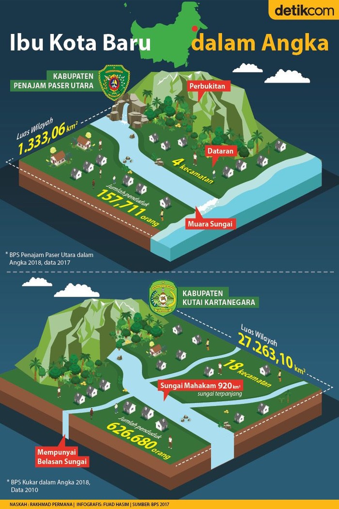 Jakarta - Presiden Jokowi mengumumkan ibu kota baru pengganti Jakarta, yakni kawasan Kabupaten Penajam Paser Utara dan Kutai Kartanegara, Kalimantan Timur. Berikut data kedua kawasan.