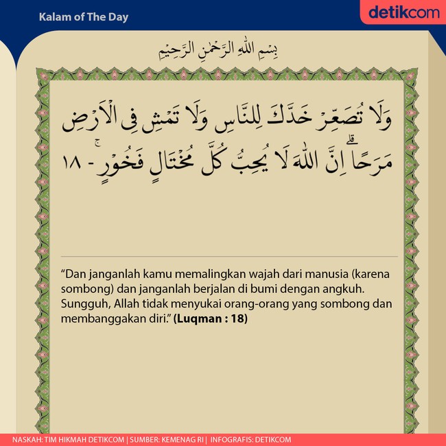 "Dan janganlah kamu memalingkan wajah dari manusia (karena sombong) dan janganlah berjalan di bumi dengan angkuh. Sungguh, Allah tidak menyukai orang-orang yang sombong dan membanggakan diri."