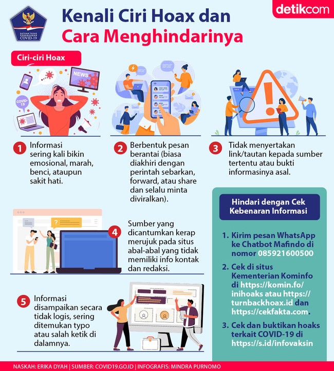 Jakarta - Di tengah pandemi, banyak informasi palsu atau hoax beredar soal pengobatan, penanganan pandemi, hingga vaksinasi. Jangan asal percaya karena hoax bisa berbahaya bagi masyarakat.