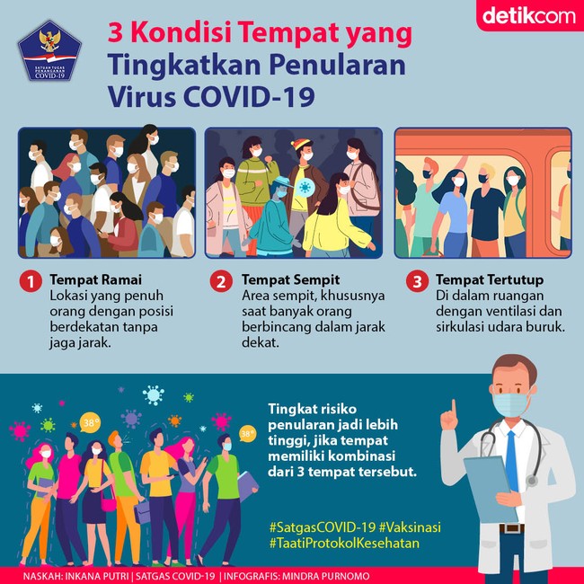 Jakarta - Penularan COVID-19 dapat terjadi di mana saja. Berikut 3 kondisi tempat yang meningkatkan resiko penularan.
