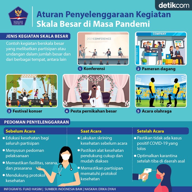 Guna mempercepat pemulihan ekonomi nasional, Pemerintah mengizinkan penyelenggaraan kegiatan besar di tengah masyarakat. Ketentuan ini diikuti sejumlah aturan dan pedoman yang telah ditetapkan.