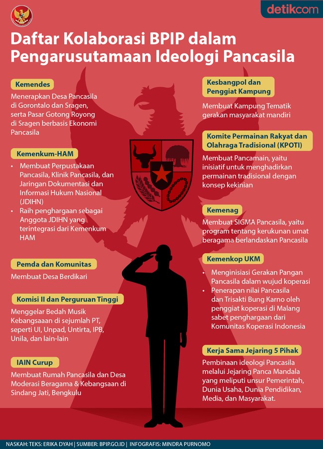 Jakarta - Badan Pembinaan Ideologi Pancasila (BPIP) terus melakukan upaya pengarusutamaan ideologi Pancasila di tengah masyarakat. Upaya pengarusutamaan ini dilakukan oleh BPIP dalam kolaborasinya dengan berbagai pihak melalui program-program berikut ini.