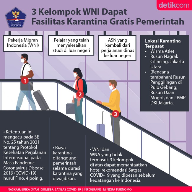 Jakarta - Kebijakan karantina diberlakukan untuk para pelaku perjalanan luar negeri yang memasuki Indonesia. Untuk itu, pemerintah menyediakan fasilitas karantina gratis untuk sejumlah kelompok WNI berikut ini.