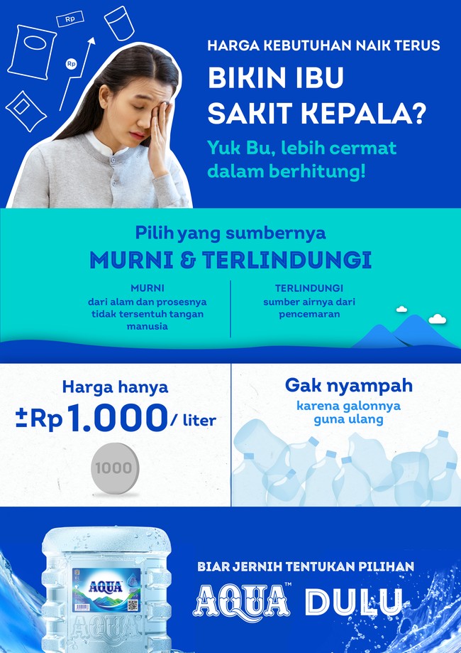 Harganya pun terjangkau, sebab harga air mineral AQUA hanya ±Rp1.000/liter! Air berkualitas yang berasal dari sumber alami AQUA ini akan terus menemani hari-hari ibu cermat di rumah.