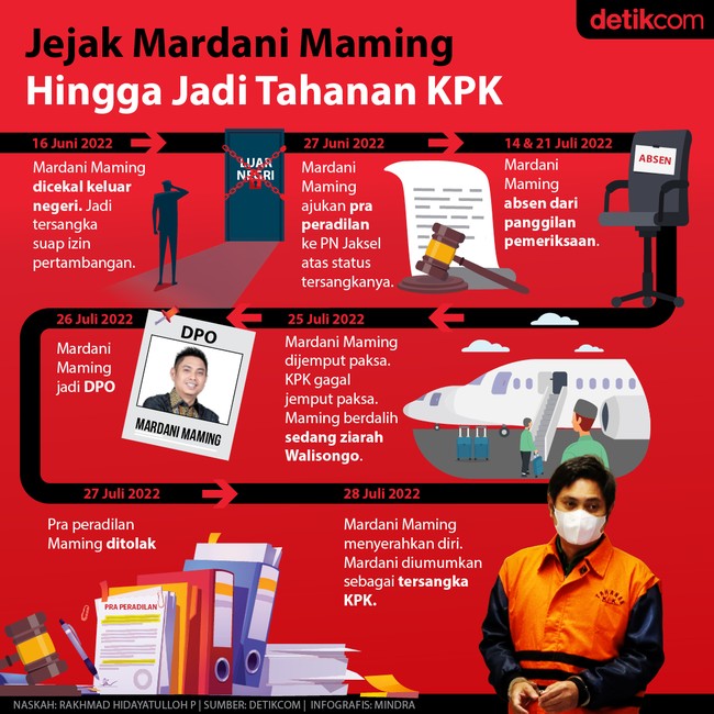 Jakarta - Mantan Bupati Tanah Bumbu, Mardani H Maming menjadi tersangka kasus suap izin pertambangan. Sebelum diumumkan sebagai tersangka, Maming sempat dijemput paksa tetapi gagal. Begini perjalanan kasusnya.