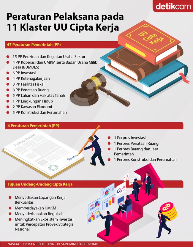Jakarta - Pemerintah telah menerbitkan sejumlah Peraturan Pelaksana pada 11 klaster dalam Undang-Undang Cipta Kerja. Peraturan Pelaksana tersebut terdiri atas 47 Peraturan Pemerintah (PP) dan 4 Peraturan Presiden (Perpres).