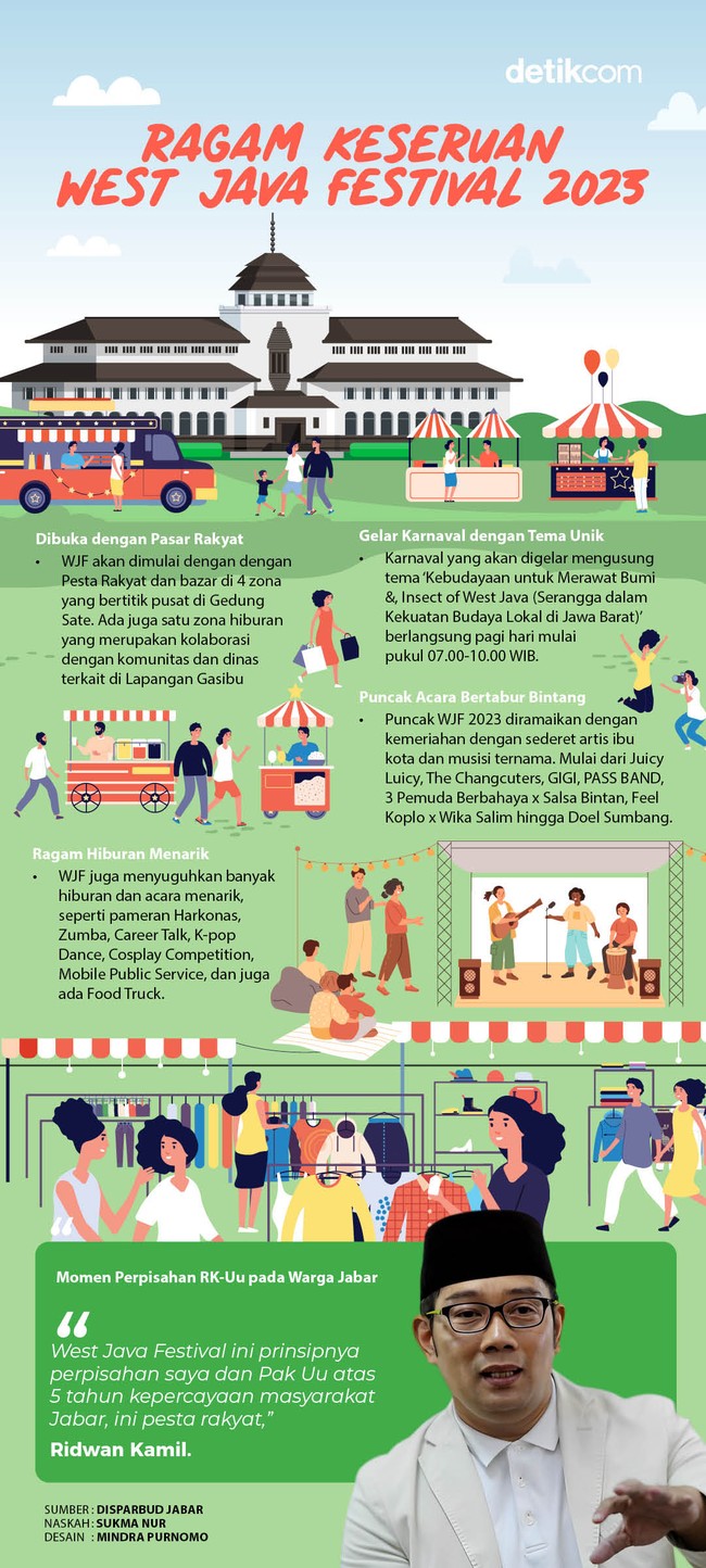 Jakarta - Dalam rangka memeriahkan Hari Ulang Tahun (HUT) ke-78 Pemerintah Provinsi Jawa Barat (Jabar) pada 19 Agustus 2023 lalu, Pemprov Jabar akan menggelar West Java Festival (WJF) 2023. Kegiatan ini akan menghadirkan ragam keseruan untuk menghibur masyarakat, mulai dari karnaval hingga pesta rakyat di Bandung, pada 2-3 September 2023 mendatang.