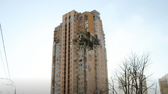 Roket milik Rusia itu menghantam antara lantai 18 dan 21 apartemen. Rusia dituding berbohong hanya menyerang infrastuktur militer.