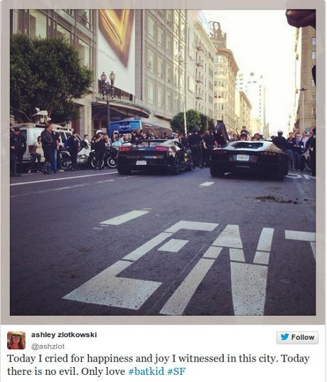 Kepala Polisi San Francisco, Greg Suhr, memerintahkan salah seorang personelnya mengenakan jubah Batman guna membantu Scott. Merekau pun dielu-elukan sepanjang jalan.
