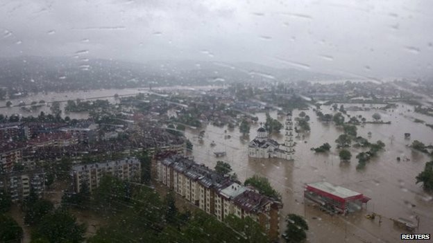 Diamati dari udara hampir sepertiga dari Bosnia, terendam akibat banjir itu. Kota-kota di Bosnia terlihat seperti danau berlumpur besar. Jalan protokol dan jalur rel kereta api utama juga terendam.