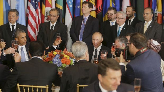 Obama dan Putin sempat saling bersulang, namun suasana tegang dan kikuk antara keduanya tetap terlihat. Saat bersulang, Obama memberikan tatapan tajam sedangkan Putin sedikit tersenyum. Tidak lama kemudian Sekjen PBB Ban duduk di antara keduanya, sedikit mencairkan ketegangan.