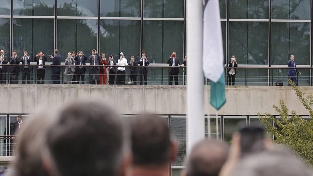Para pejalan kaki yang melintasi kompleks ini menyempatkan diri berhenti sejenak dan menyaksikan pengibaran ini. Beberapa bahkan sibuk mengabadikan momen haru ini dengan kamera telepon genggam mereka.