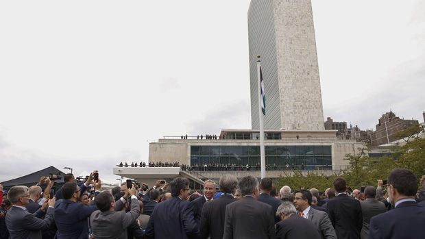 Perlahan, bendera yang didominasi warna merah, putih, hijau dan hitam itu dikibarkan di salah satu tiang di kompleks markas utama PBB. Mereka yang hadir tampak khidmat dan fokus menyaksikan momen bersejarah ini.