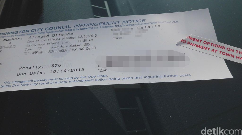 Besaran tilangnya AU$ 76 (Rp 760 ribu) dan harus dibayar sampai tanggal tertentu. Bila tidak, maka tindakan penegakan hukum lebih lanjut akan diberlakukan.